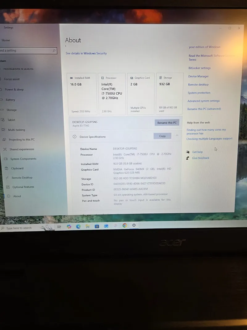 1TB HDD Windiws 10 Acer laptop, in really good working condition battery holds charge really well, it does not overheat or makes makes noise, please checkout the specs in photos.Can test it before payment. Comes with charger